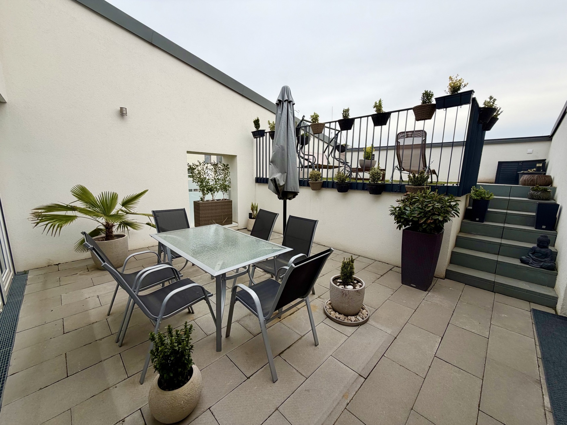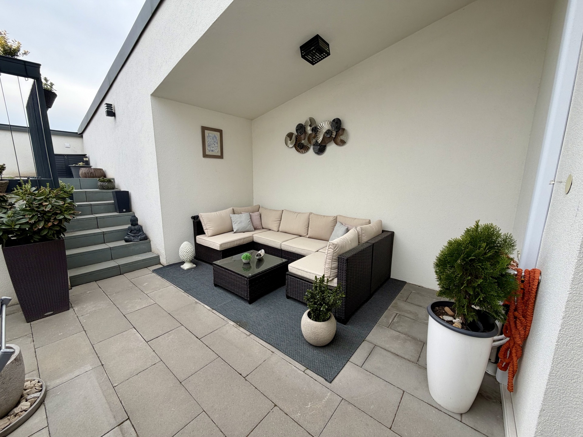 Az ingatlan egyik legkülönlegesebb értéke a hatalmas, tágas, napfényes és intim tetőterasz, amely műfüvezett kertrésszel, valamint panorámás kilátással rendelkezik. Az ilyen egyedi, intim terasz a környéken valódi ritkaság, különösen ilyen felső szinti elhelyezkedéssel.